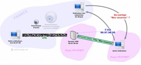 Une dernière utilisation qui a connu une certaine popularité grâce à Hadopi : l’utilisation de fournisseur de service VPN à l’étranger afin de télécharger des fichiers dits illégaux. Ainsi, vous vous abonnez à un fournisseur suédois (par exemple), et celui ci, via le biais d’une connexion VPN vous fait profiter d’une adresse IP suédoise. La Hadopi ne visant que les ip françaises, vous êtes couverts. Ce genre de service est assez abordable (prix commençant à 12€ par trimestre).